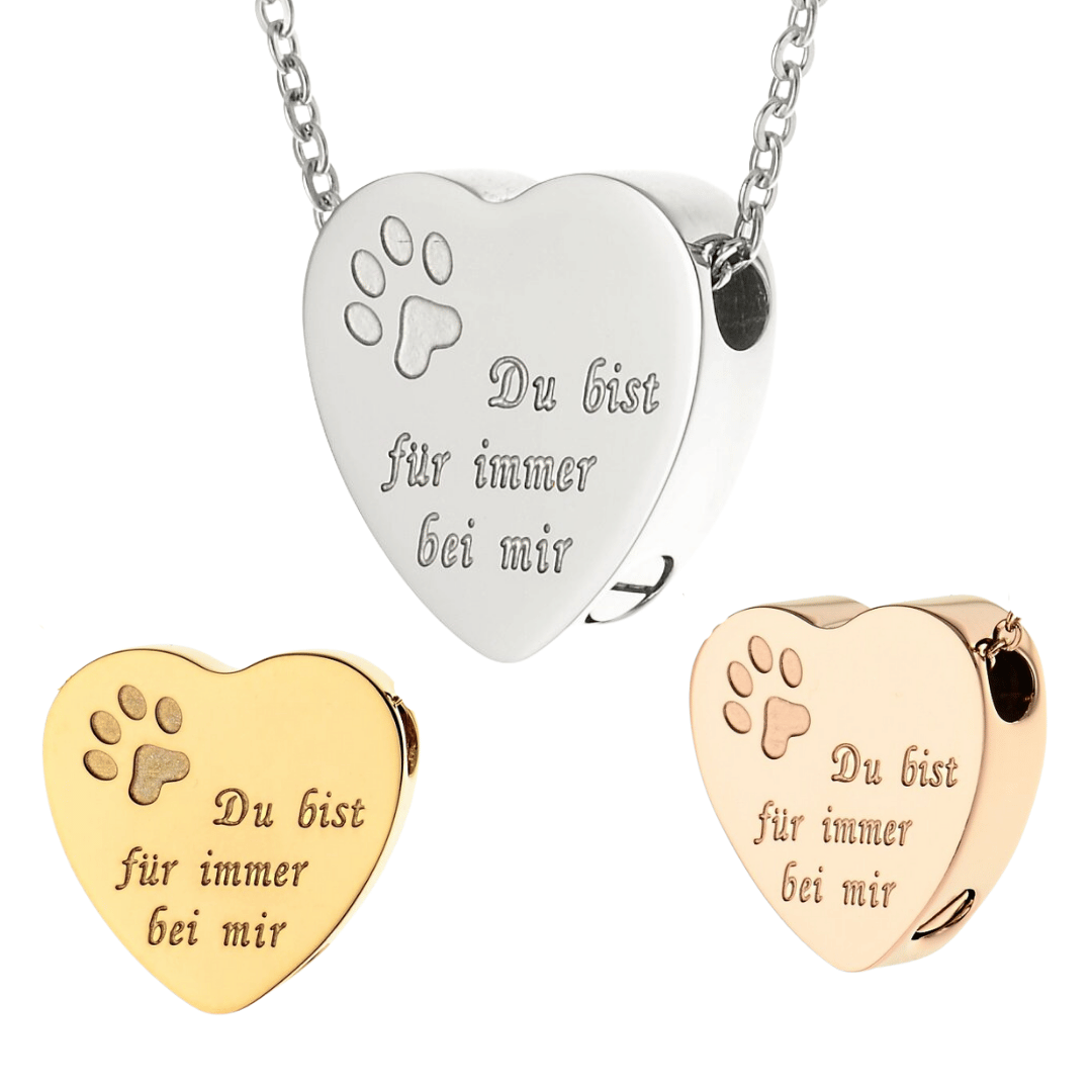Dieser Ascheanhänger besteht aus hochwertigem Edelstahl und ist mit einer Pfote sowie dem Gravurspruch „Du bist für immer bei mir“ verziert. Das Herz verfügt an der Seite über eine Schraube, über die Sie eine kleine Menge Asche einfüllen können. Die Kettenführung verläuft direkt durch den Anhänger.