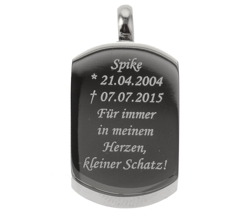 Dieser Ascheanhänger besteht aus hochwertigem Edelstahl. Im Inneren des Schmuckstücks können Sie einen kleinen symbolischen Teil der Asche oder ein anderes Erinnerungsstück Ihres geliebten Tieres aufbewahren. Der Anhänger wird am Boden des Medaillons mithilfe eines Schraubverschlusses sicher verschlossen.