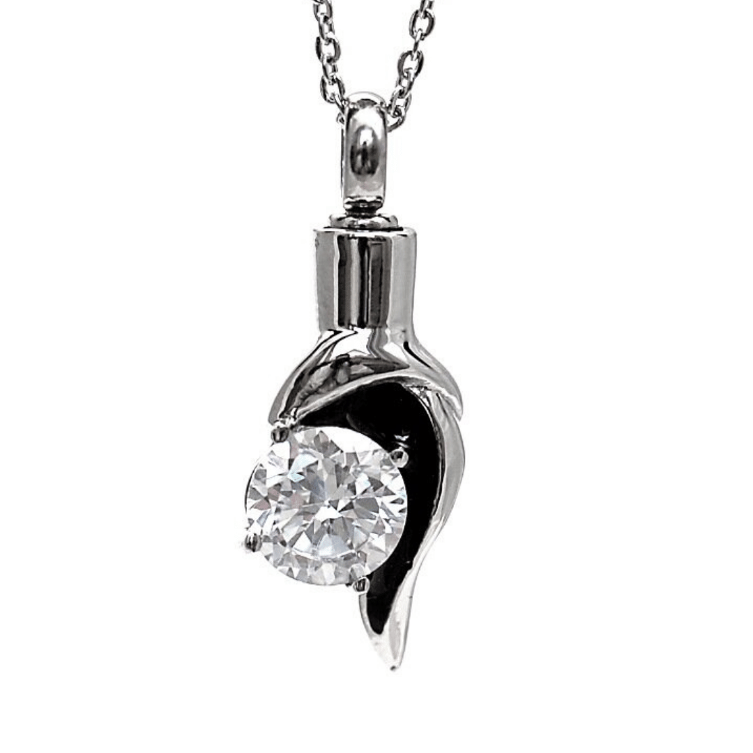 Dieser Ascheanhänger besteht aus hochwertigem Edelstahl und ist mit einem funkelnden Kristallstein verziert. Im Inneren des Schmuckstücks können Sie einen kleinen symbolischen Teil der Asche oder ein anderes Erinnerungsstück Ihres geliebten Tieres aufbewahren. Die Befüllöffnung befindet sich oben an der Öse des Anhängers.