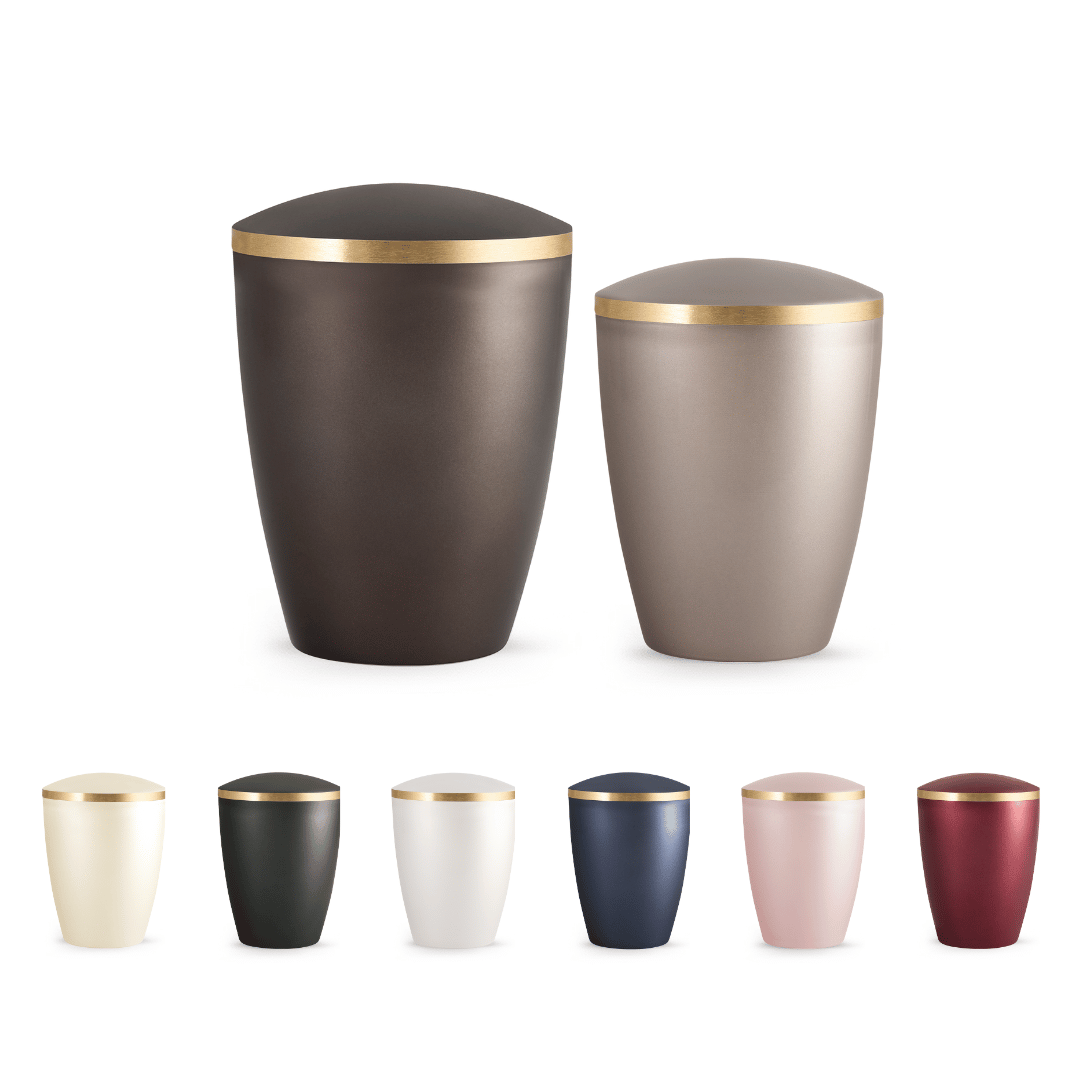 Die Urnen der Edition Elegance überzeugen durch ihre edel schimmernde, perlmuttartige Oberfläche und das elegant gebürstete Dekorband in Goldoptik.