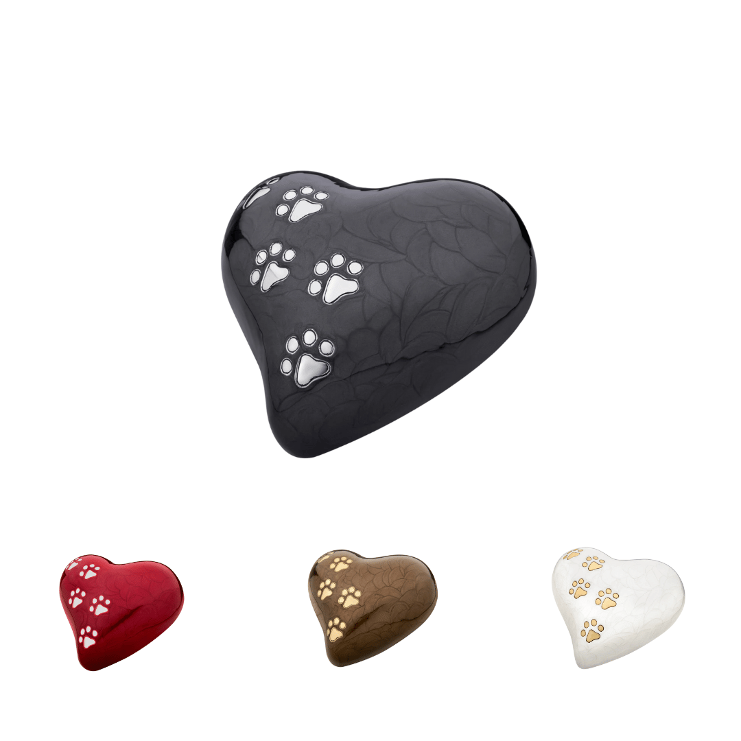 Die Tierurne ist aus hochwertigem Metall gefertigt und in vier eleganten Farben erhältlich: Schwarz, Rot, Bronze und Weiß. Die strukturierte Oberfläche verleiht dem Herzen eine besondere Tiefe, während der Schraubverschluss auf der Rückseite eine sichere und diskrete Aufbewahrung der Asche ermöglicht.