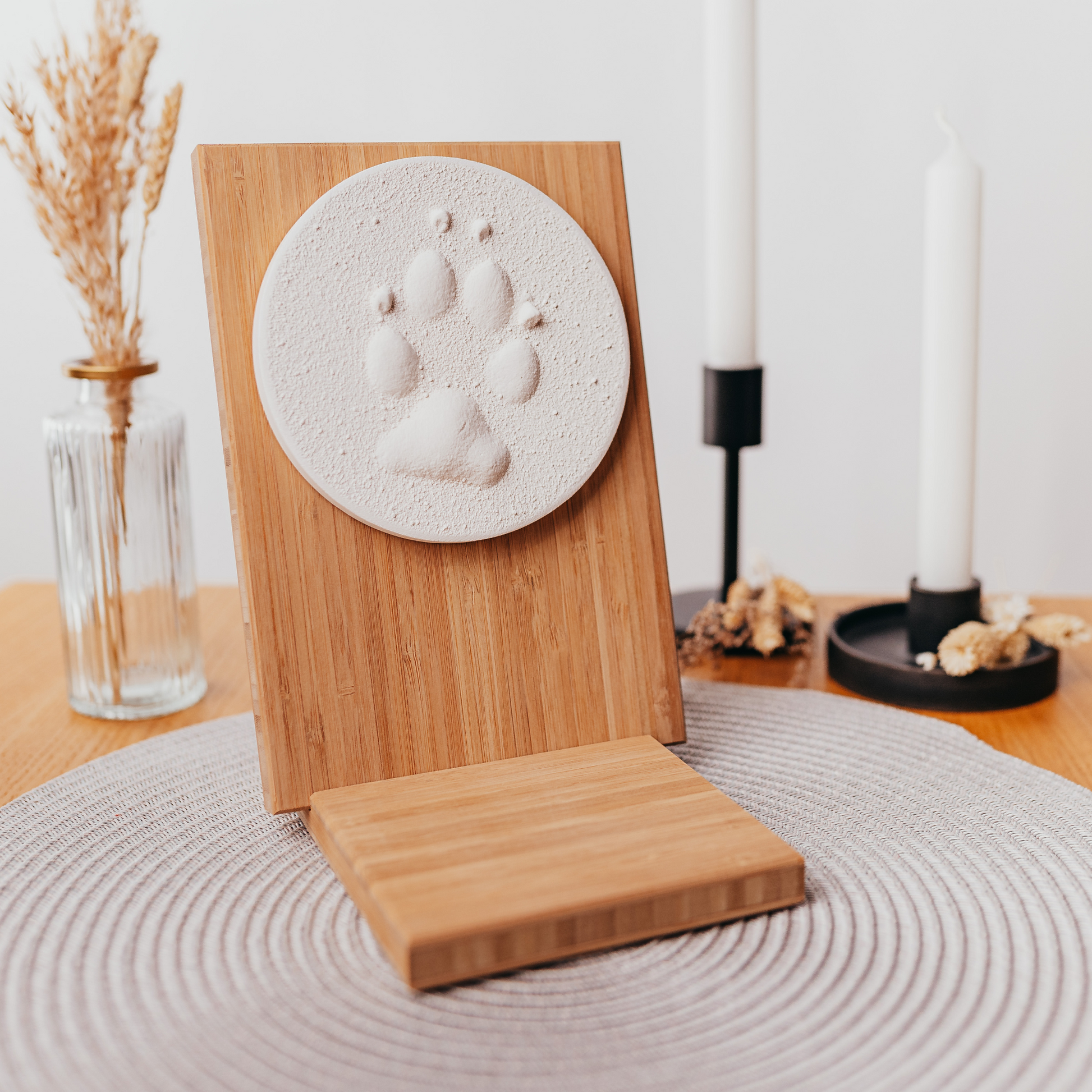Dieser 3D Abdruck aus Gipsguss verewigt die Pfote Ihres treuen Lieblings auf besondere Weise. Präsentiert auf einer Bambusplatte mit Sockel entsteht ein individuelles und einzigartiges Erinnerungsstück. Da es sich bei Bambus um ein Naturmaterial handelt, können Maserung und Farbton variieren, jedes Stück ist somit ein Unikat.