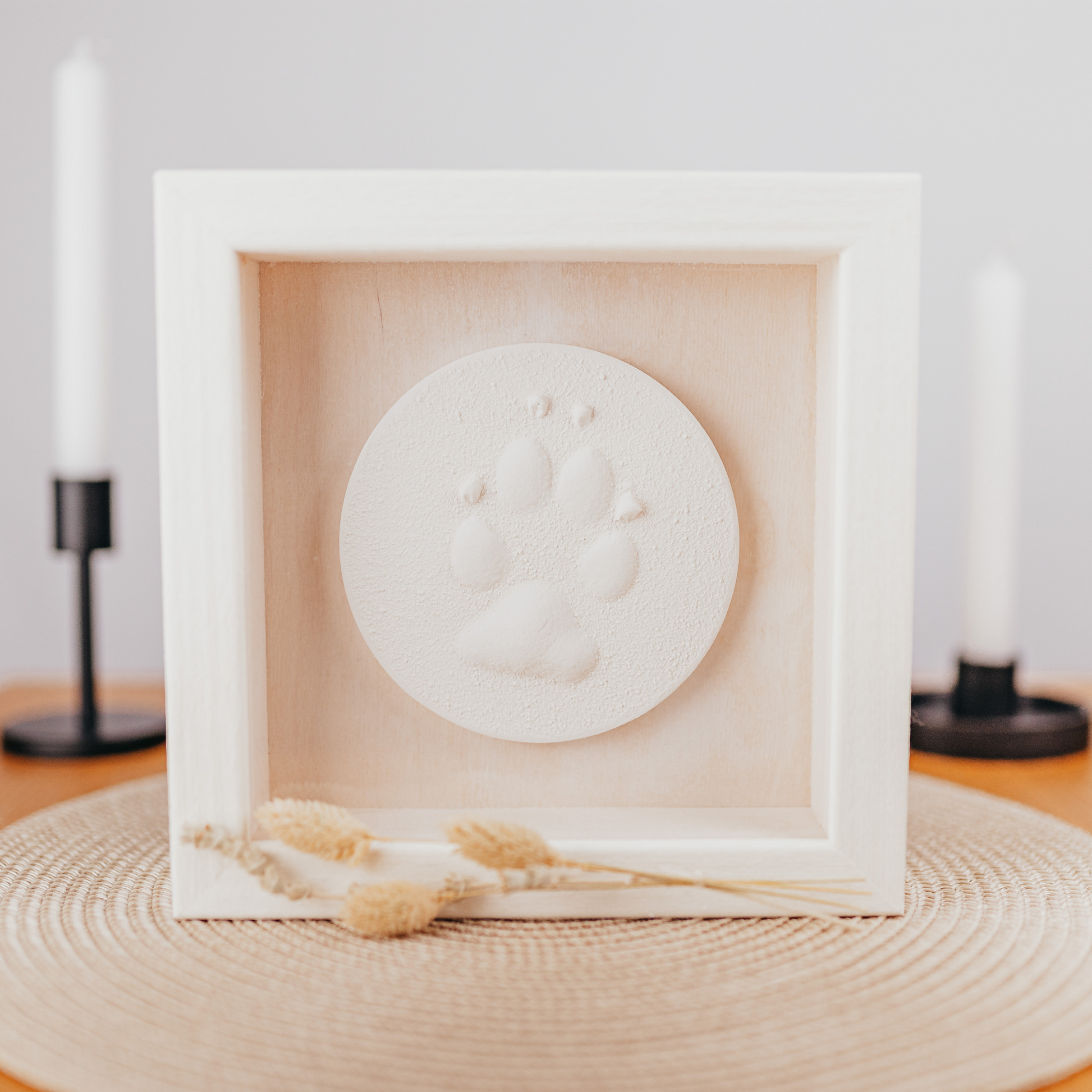 Pfotenabdruck im Bilderrahmen Weiß (optional mit Fell)