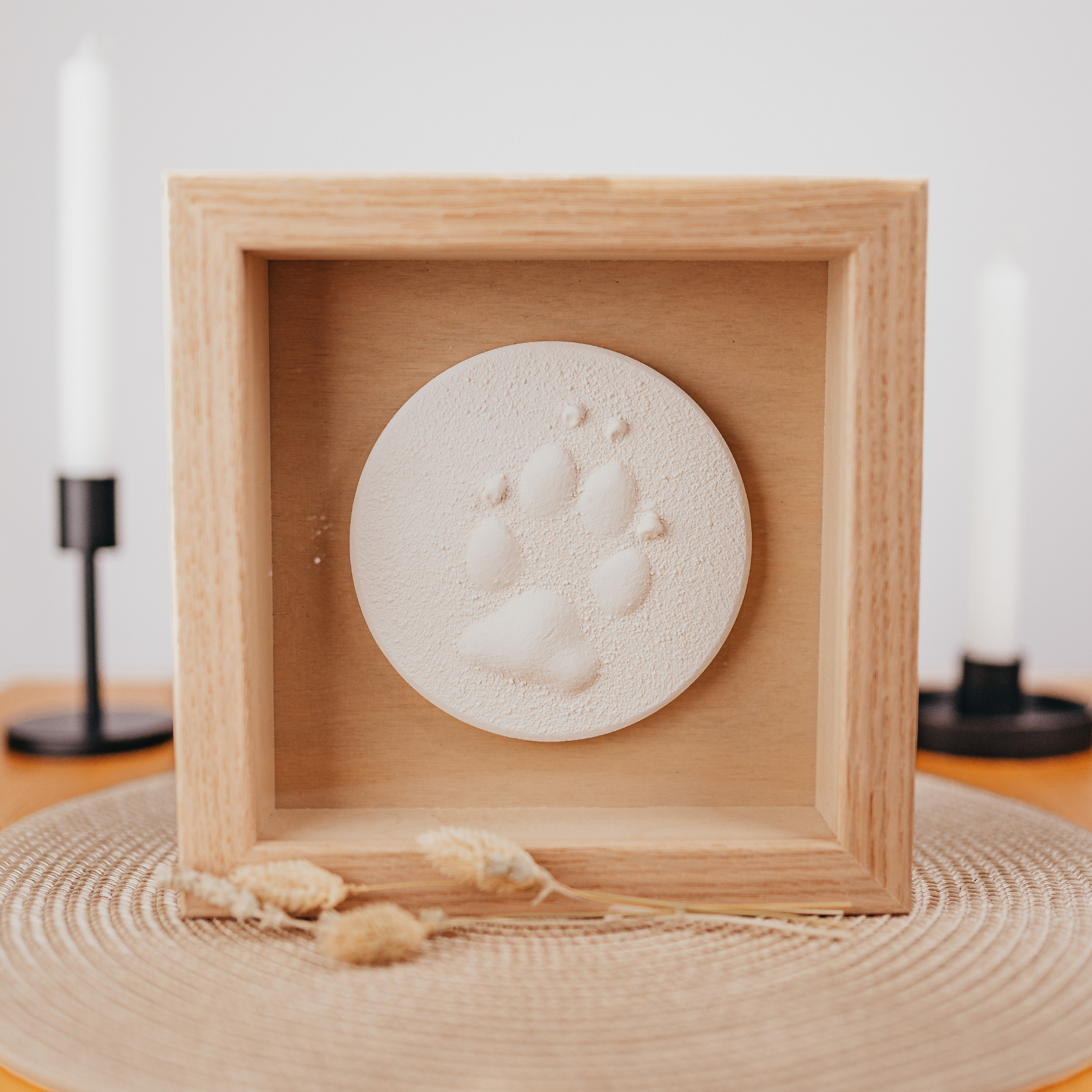 Der Pfotenabdruck Ihres geliebten Haustiers ist eine persönliche und einzigartige Erinnerung. Mit diesem speziellen Bilderrahmen können Sie diesen Abdruck stilvoll und würdevoll präsentieren. Neben dem Abdruck kann zudem eine kleine Menge Fell in einer Glasflasche in das Erinnerungsstück eingearbeitet und so auf besondere Weise bewahrt werden.